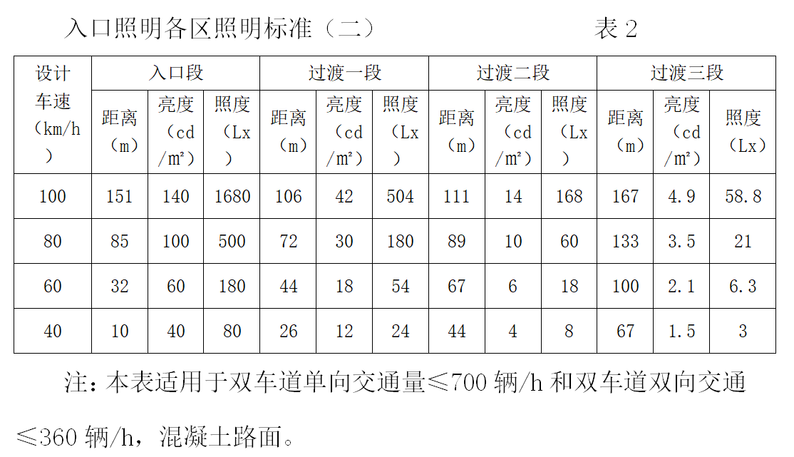 如果是大于100m的隧道,在接近隧道時可以看到隧道的出口,這樣就出現了黑框現象。為了避免這種現象對行車的影響,設置照明時應采取比表1、表2更高的亮度標準。